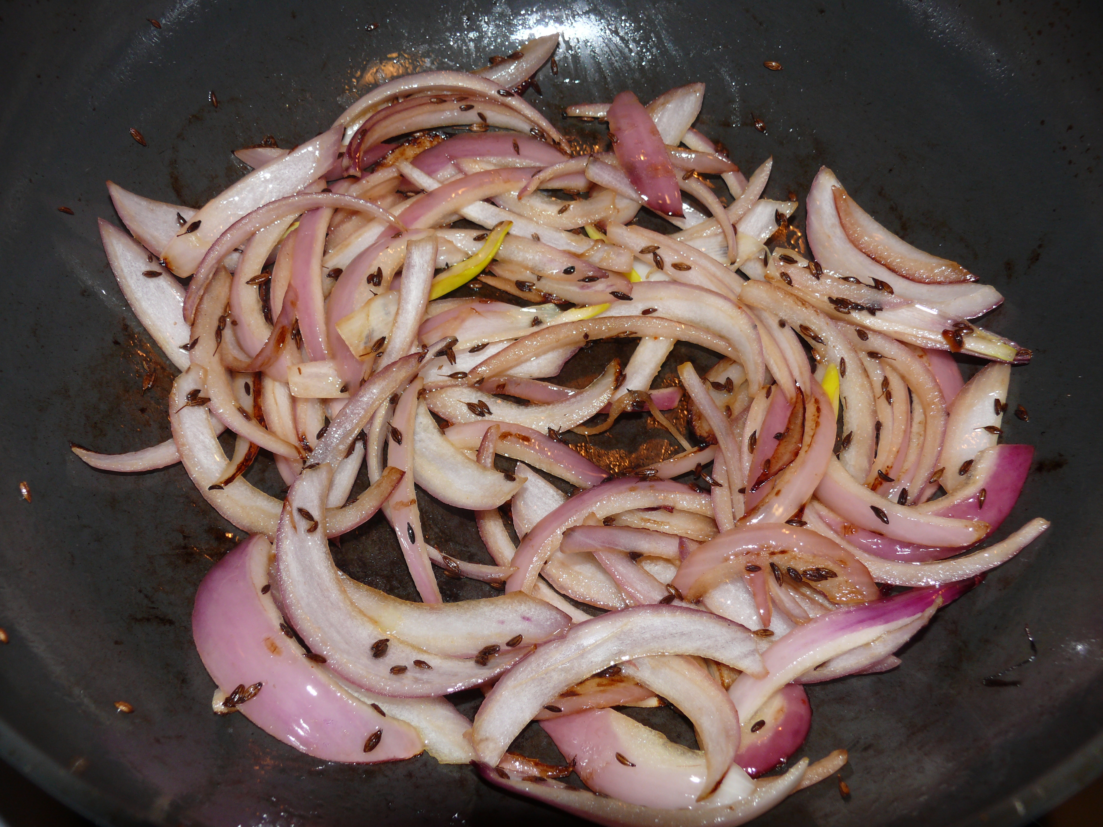 - Once cumin seeds start to get toasty, add the onions and saute until they brown, adding the garlic part way through cooking.