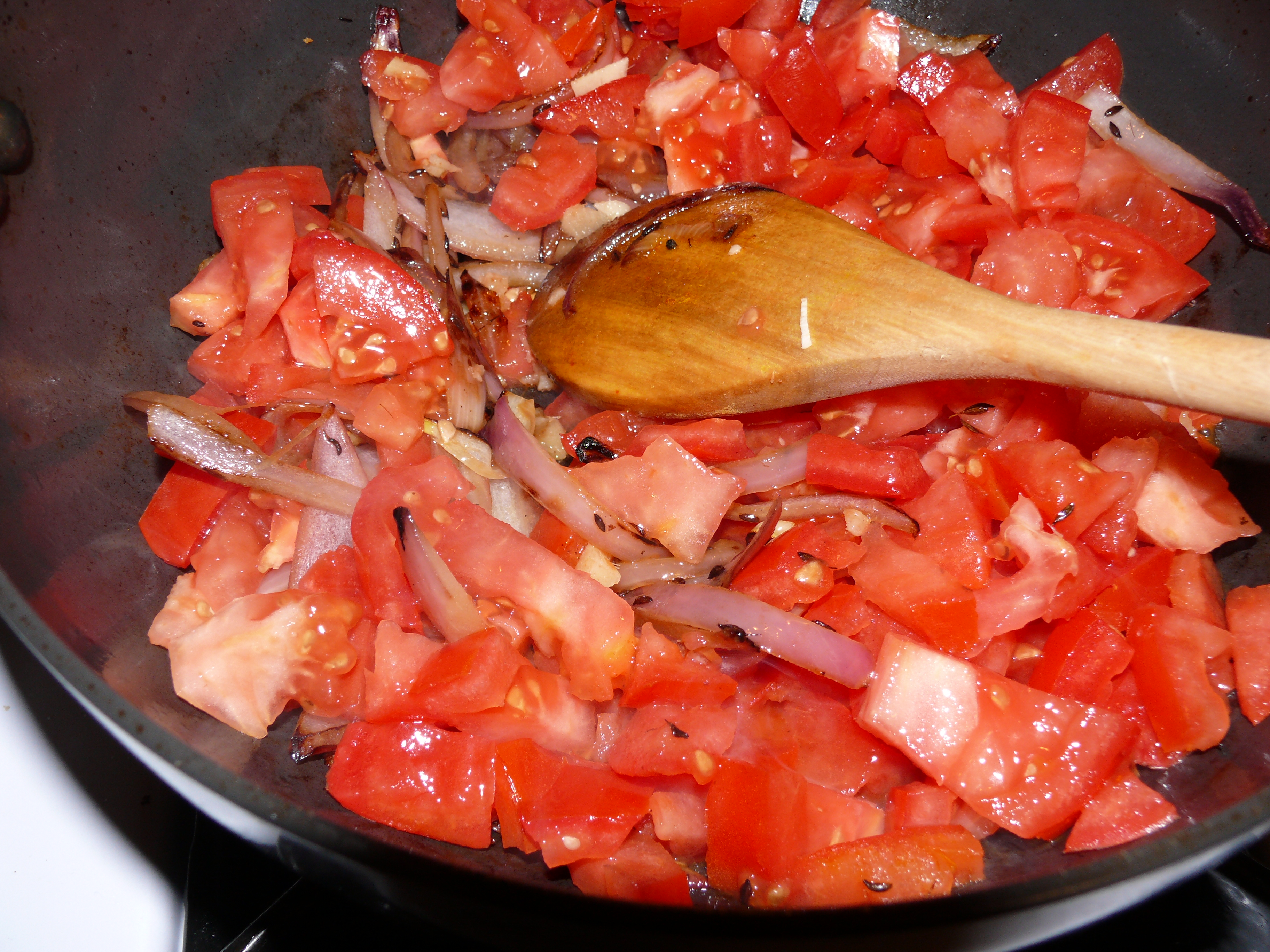 But I never use onion, garlic or ginger. Just fresh tomatoes with dry spices. It’s a ten minute instant dish.