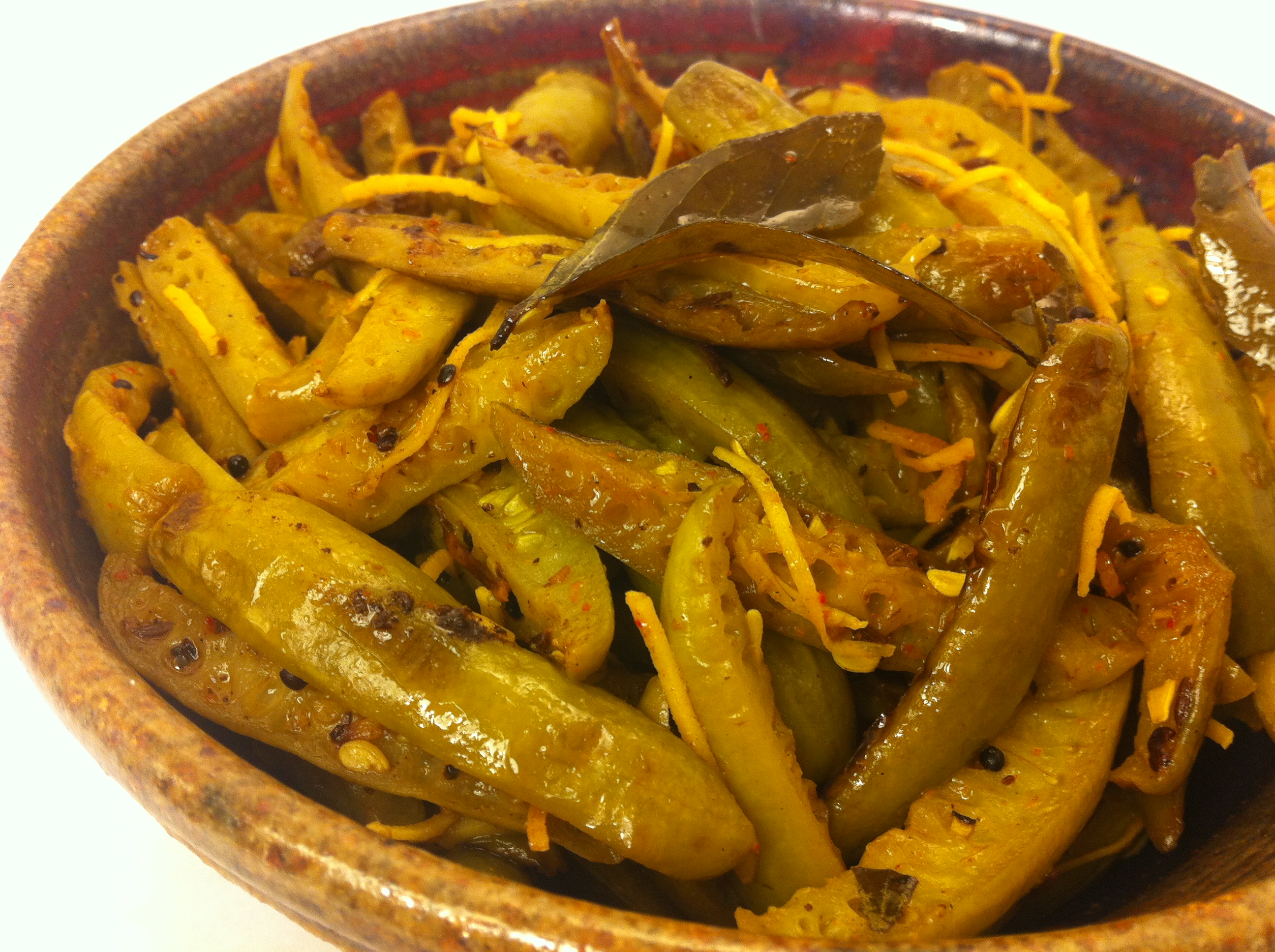- Heat oil in a medium stock pan or big saute pan (I like tall sided pans so I can stir fast and not have all the tindora fly out).