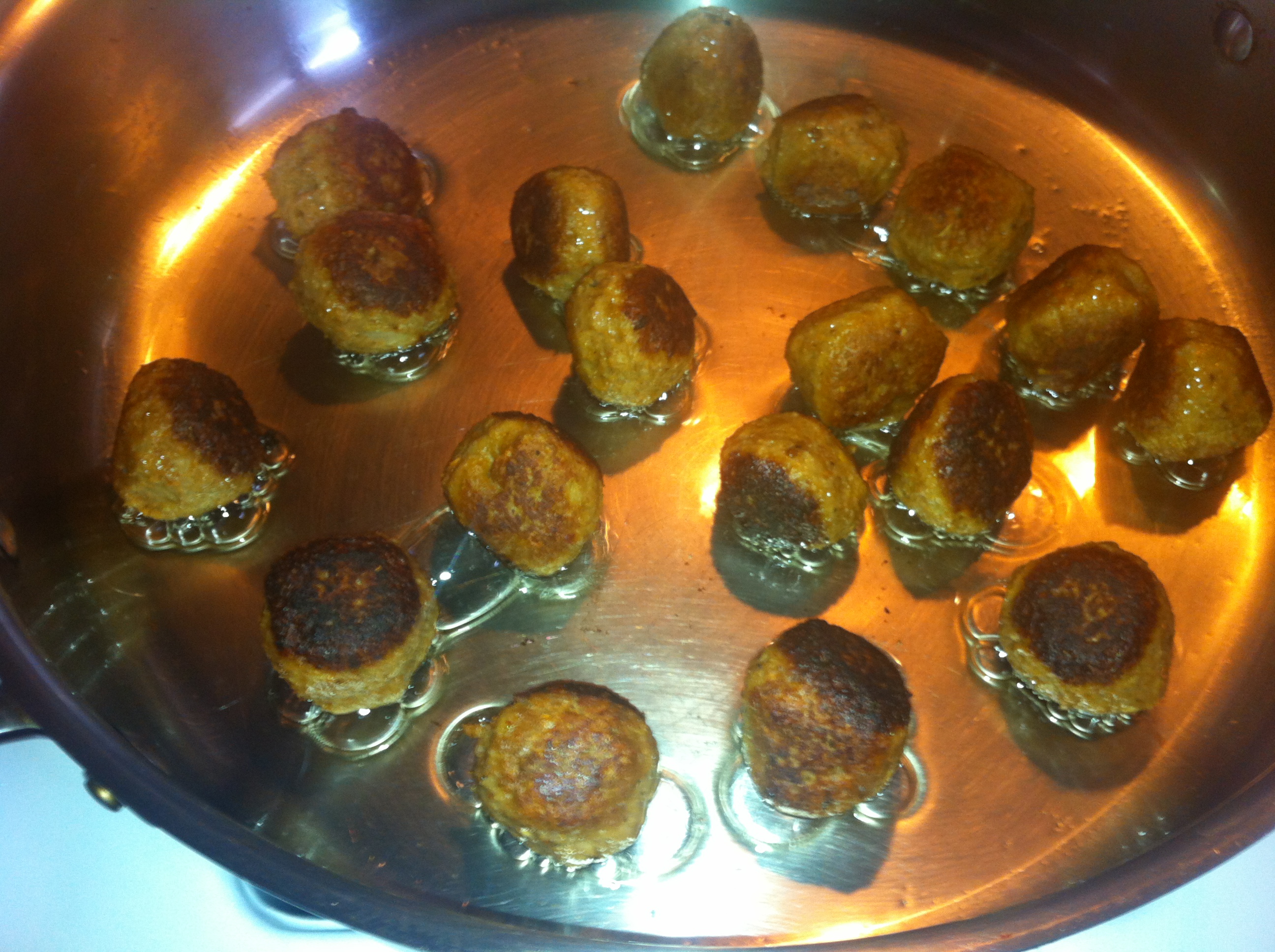- Heat more oil in the skillet and brown the meatballs on all sides.