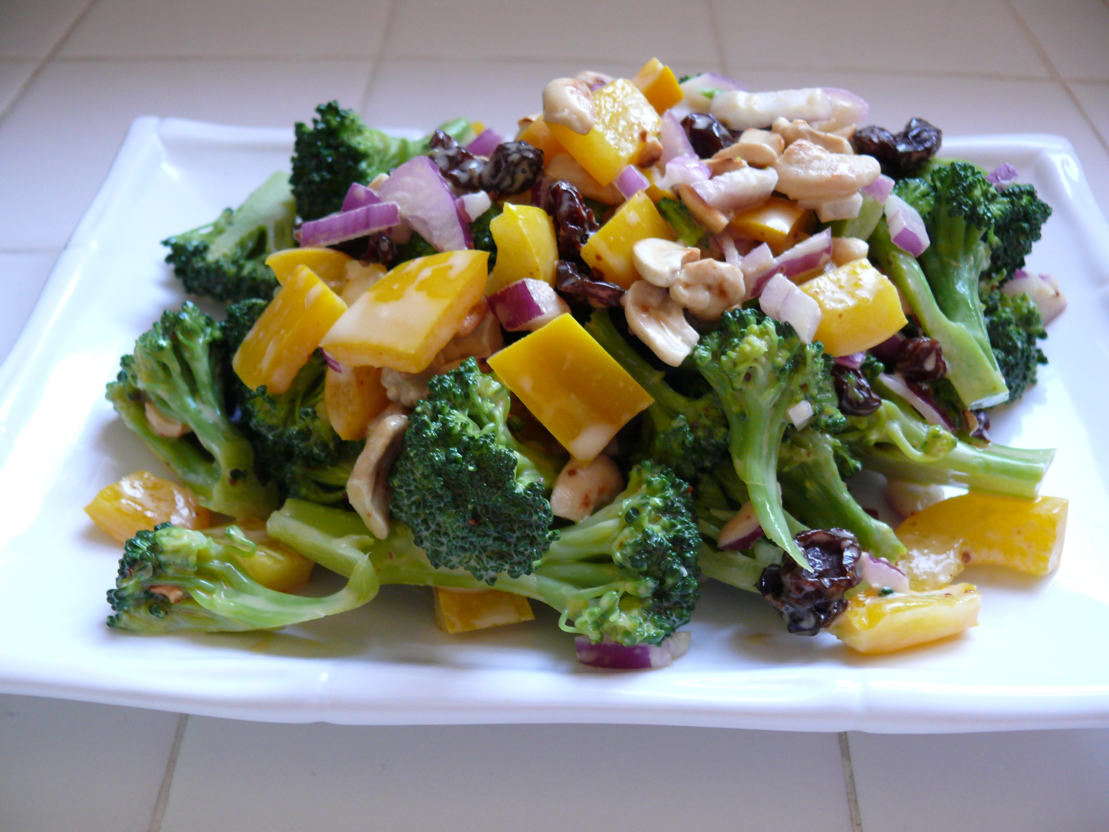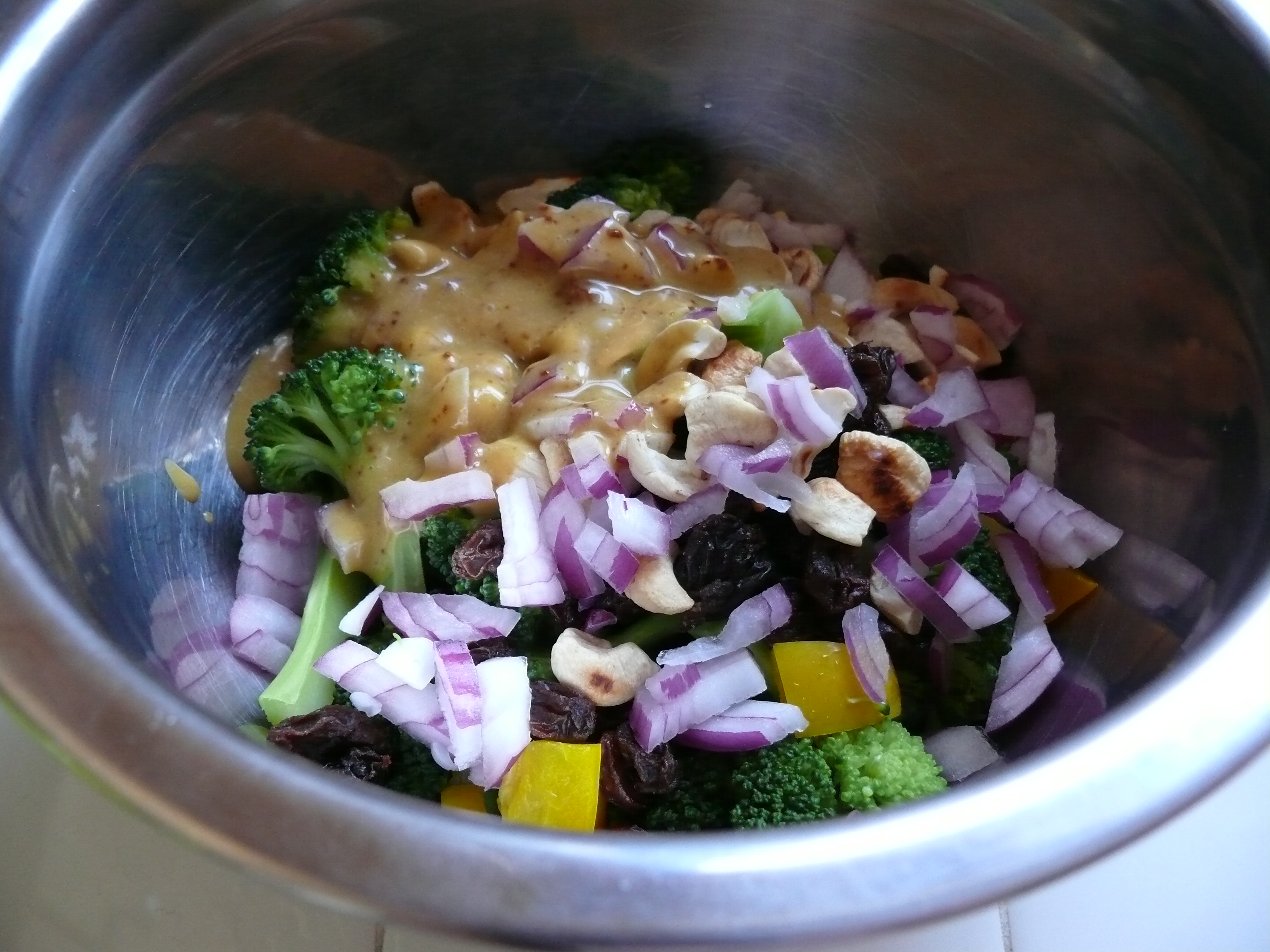 Souplantation has the most amazing salad with broccoli, raisins and cashews in a coleslaw dressing. I am not a big raw broccoli fan, but I love this salad! This is vegetarian version that omits the bacon. You could add tempeh bacon which I didn’t have at the time. I blanch the broccoli to take away the raw taste, but they should still be crunchy. I also added yellow bell pepper.