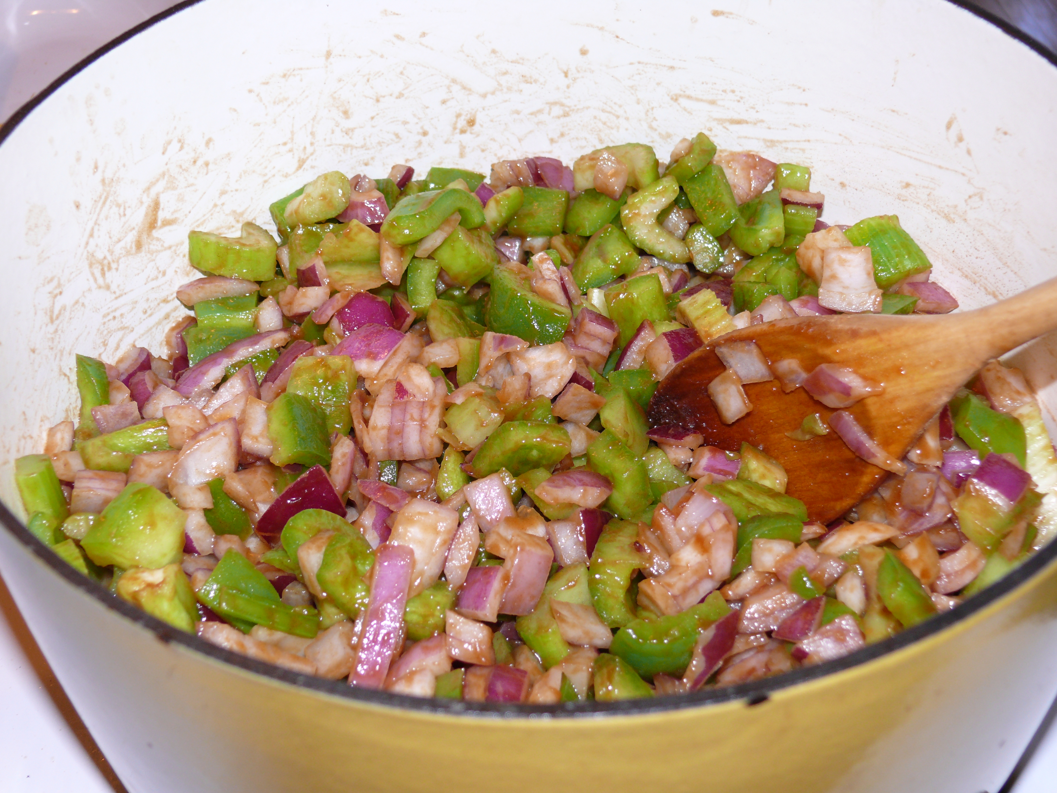 - Add onions, celery, and bell pepper to the roux and cook stirring often until the onions soften, adding the garlic part way through cooking.