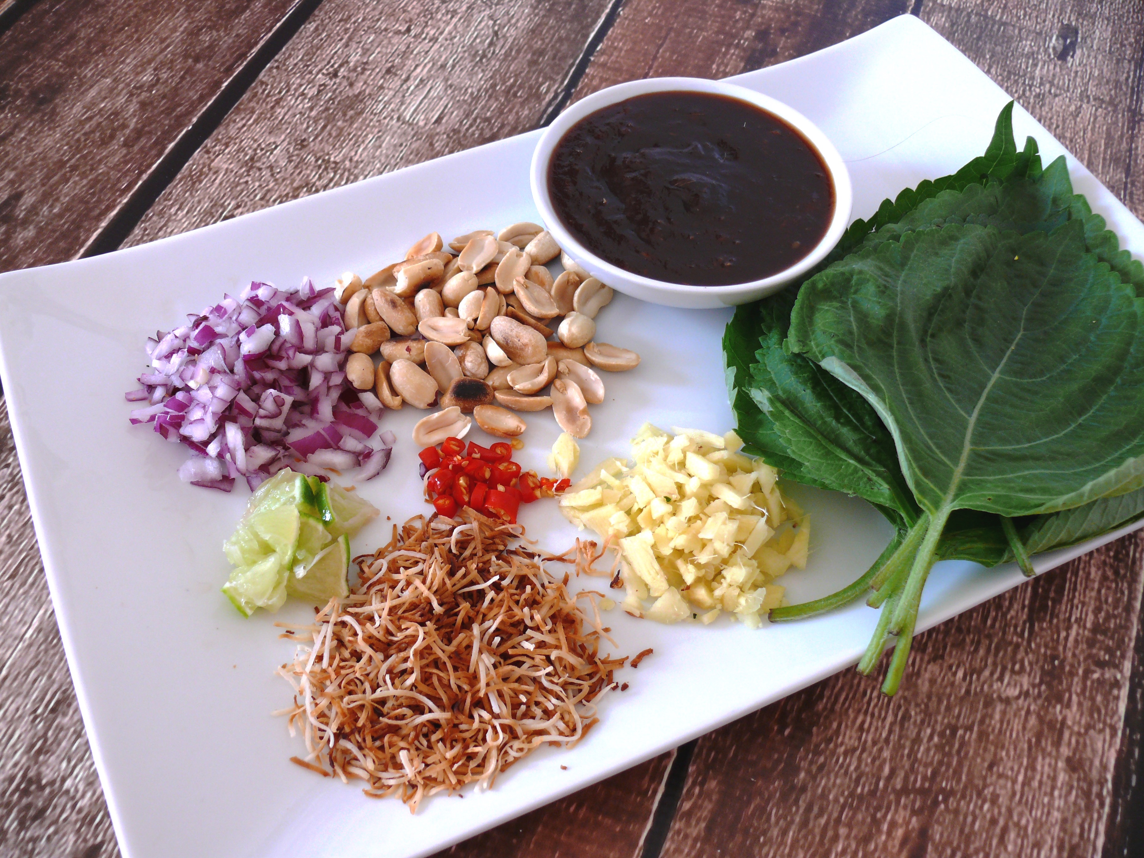 - On a platter or in small bowls put all the ingredients. Make each parcel by taking a leaf, adding coconut, peanuts, onions, ginger, red chili and topping with sauce. Delish!