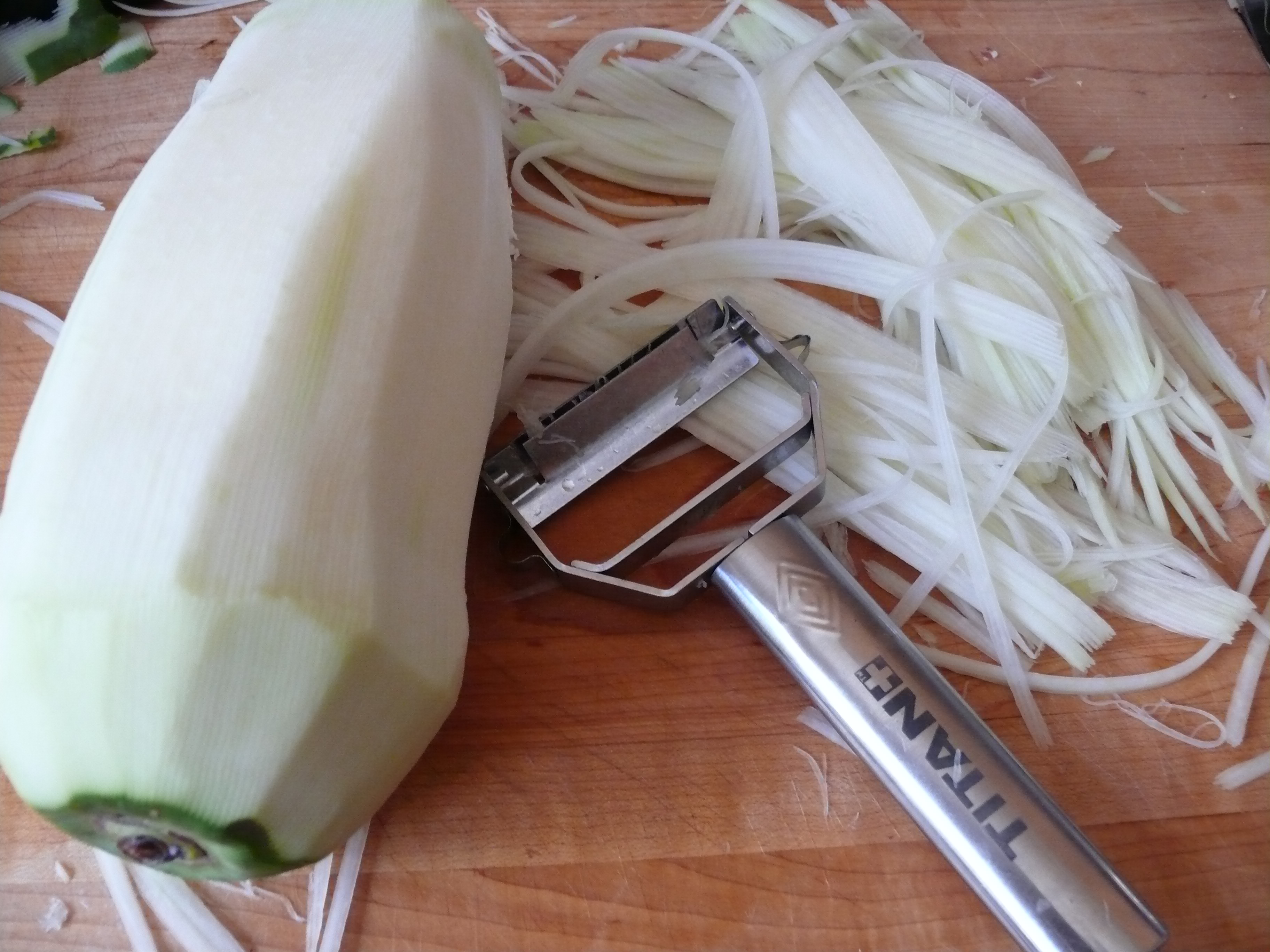 A julienne peeler makes this salad really easy. There are all kinds of julienne peelers, I happened to get this Titan one on an infomercial years ago. If you don’t have a julienne peeler, you can make lots of knife cuts lengthwise on a peeled papaya and then use a regular peeler to shave off the strips that were created by the knife.