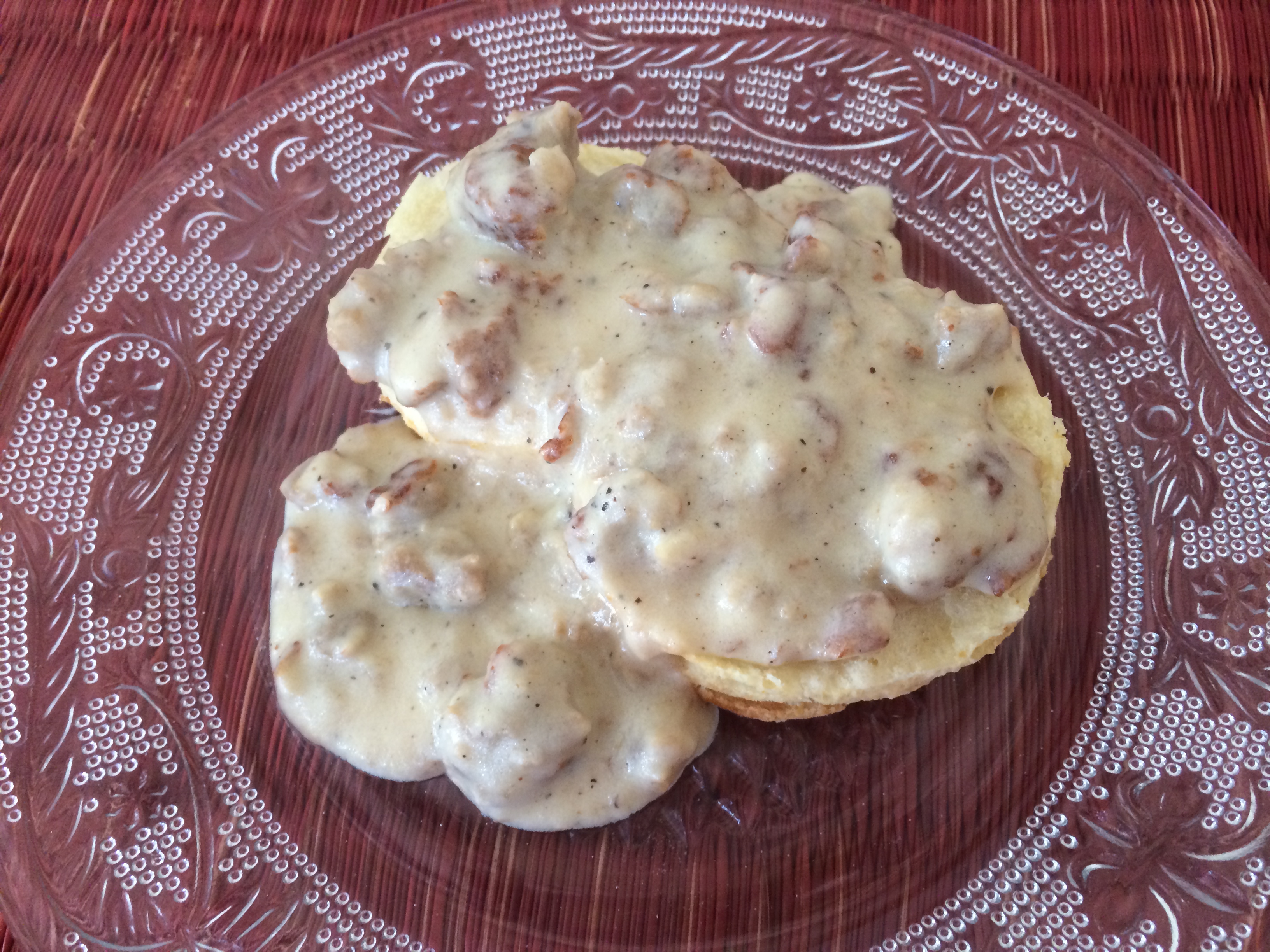2. Heat up the breakfast sausages in a skillet or in the microwave. Chop into little pieces. Throw into the gravy and add salt to taste and tons of fresh ground pepper. Cook for a couple of minutes. If you make this a while before eating, you might need to add a little more milk