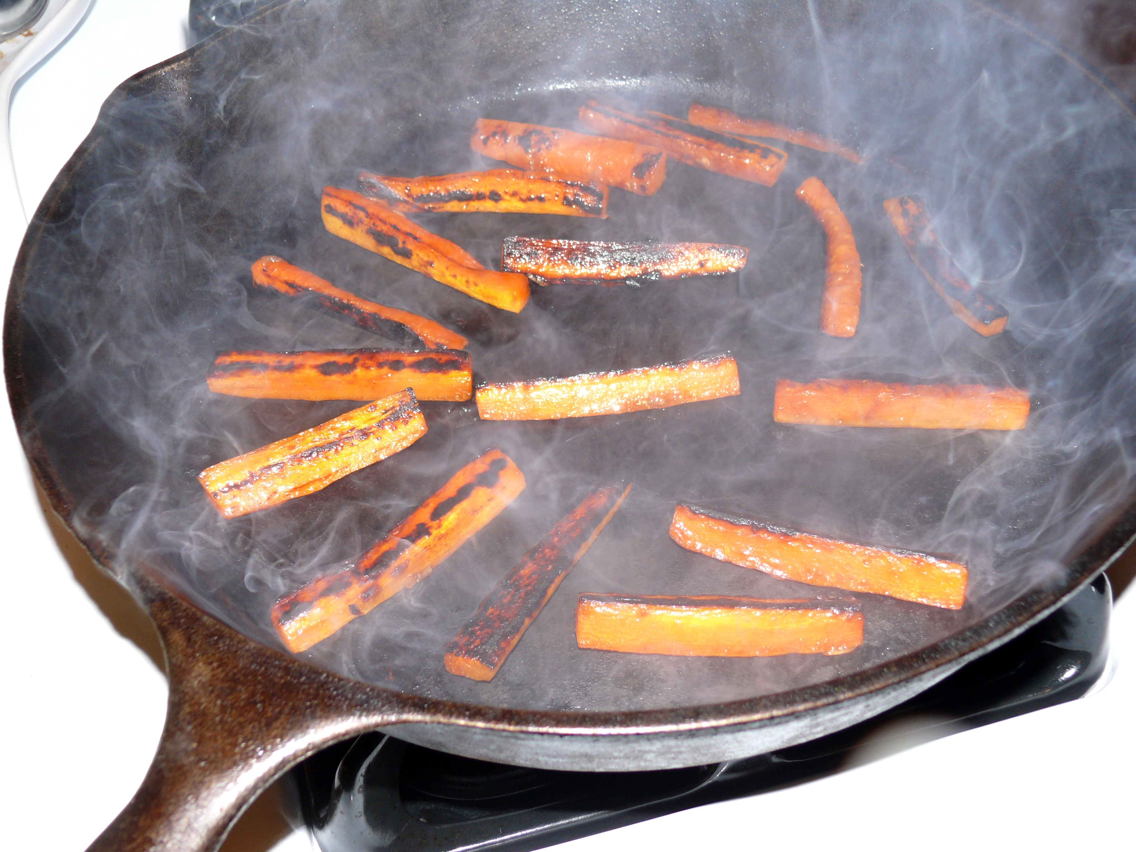 - Charred Carrots: Add vinegar, sugar, salt and carrots to the same small pan, then barely cover with water. Boil until the water is almost gone and the carrots are tender. Remove carrots from pan. Heat a dry cast iron pan until smoking. Add carrots to the smoking cast iron pan in a layer and leave put for a couple of minutes. Once blackened turn over and blacken the other side. Remove from pan.