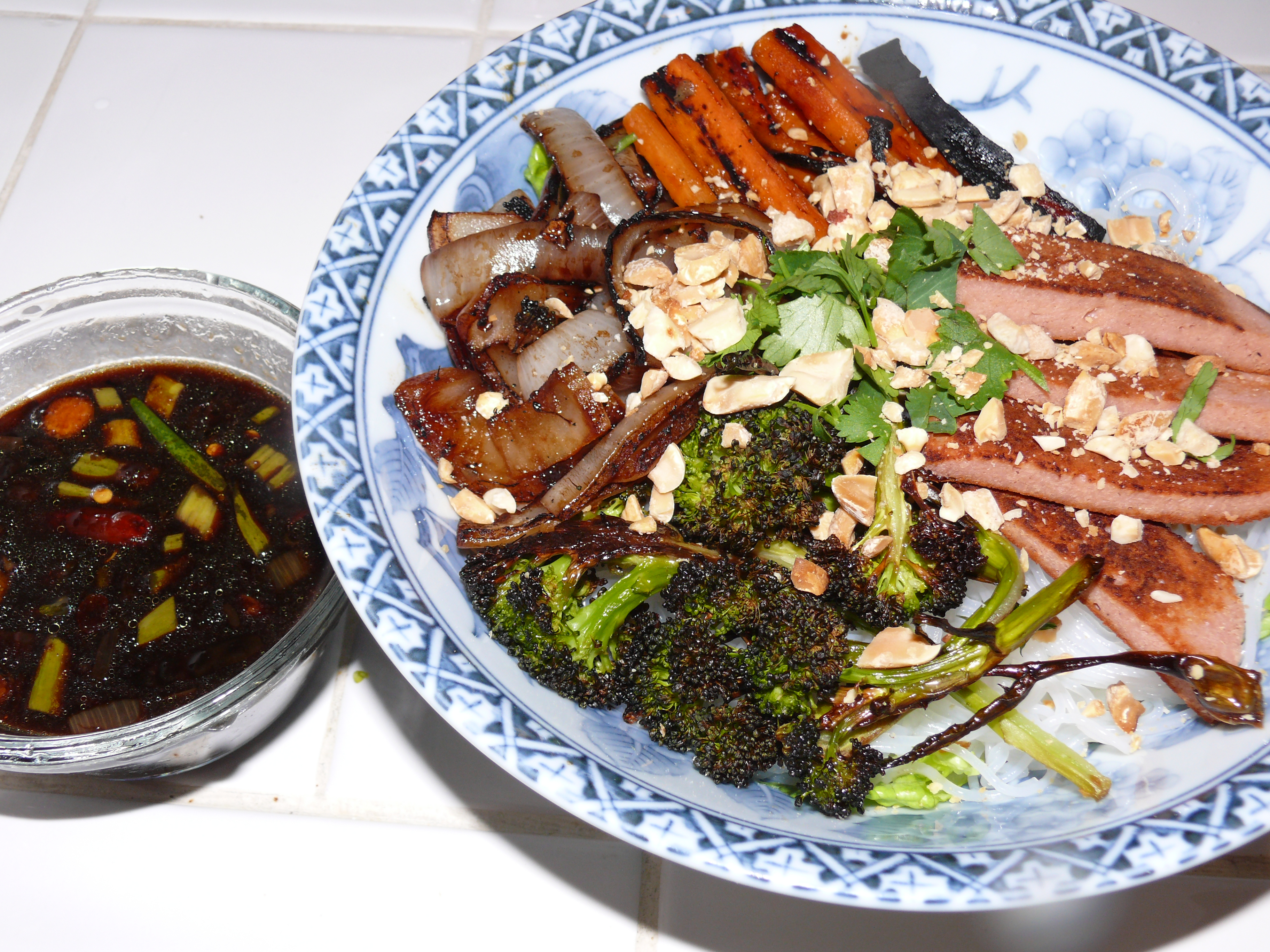 - Make your bowl! Layer of lettuce, layer of rice vermicelli, broccoli, carrots, onions, veggie ham or tofu, then top with cilantro, peanuts, and sauce.