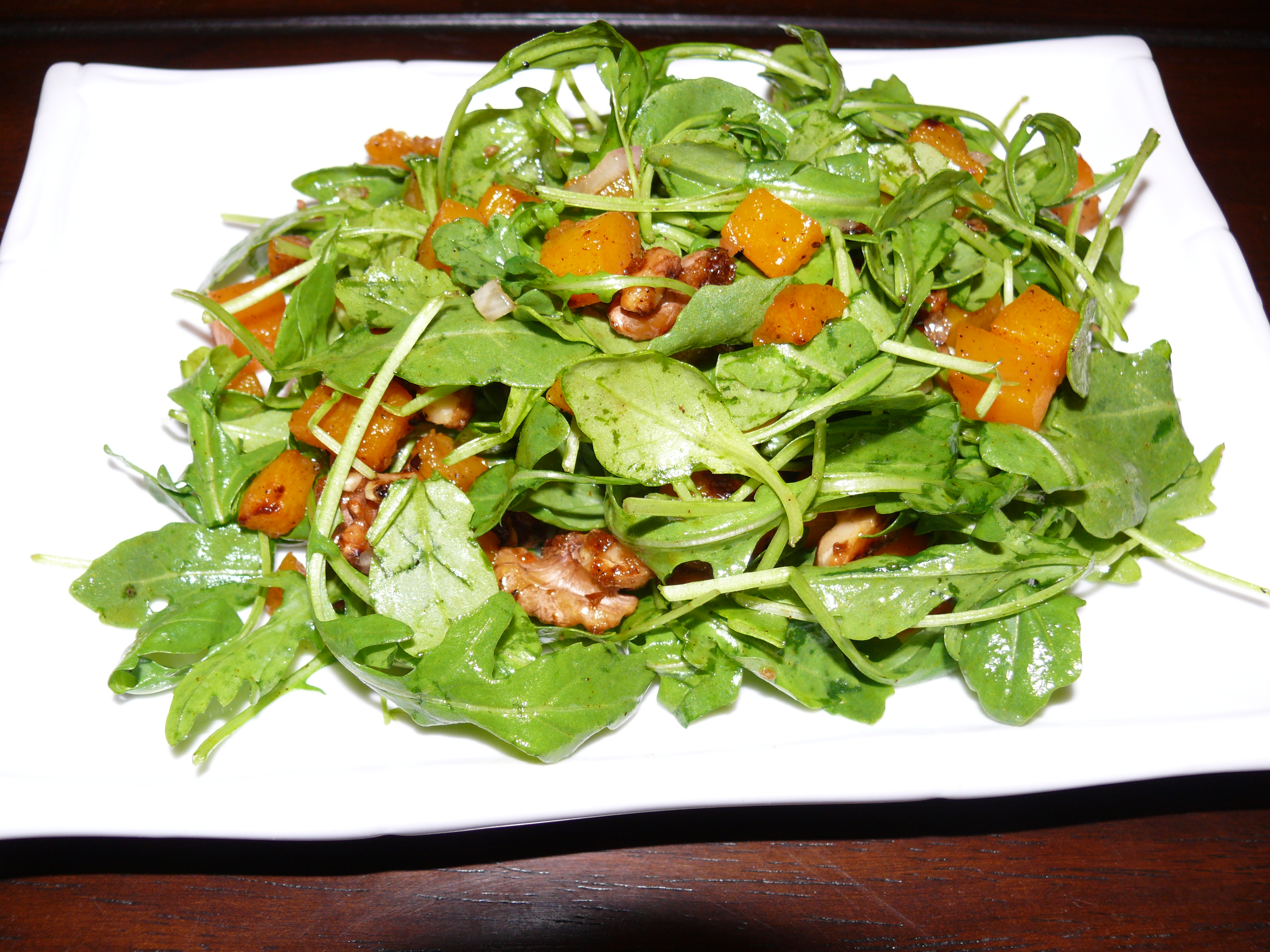 - Toss the arugula with the squash, dressing and walnuts. Enjoy!