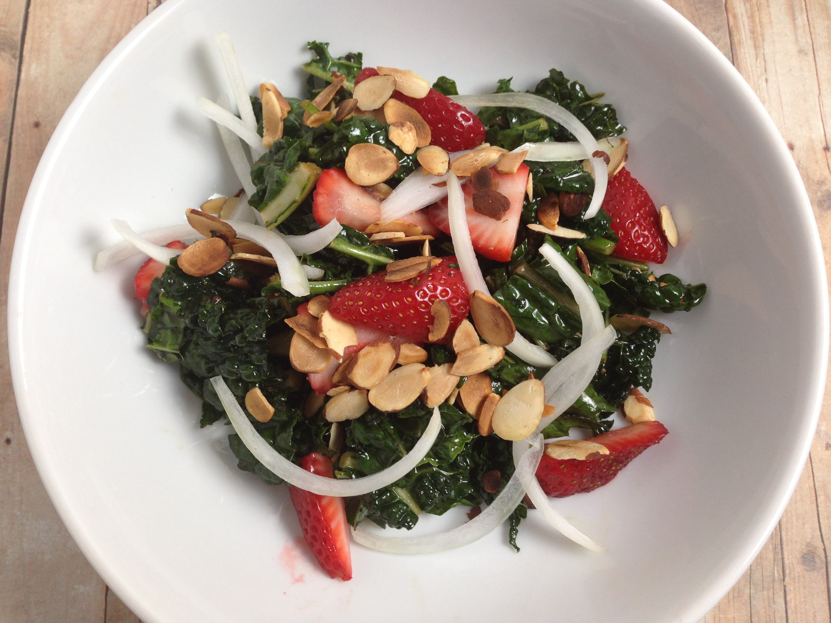 5. Throw the onions, almonds and strawberries into the kale and toss.